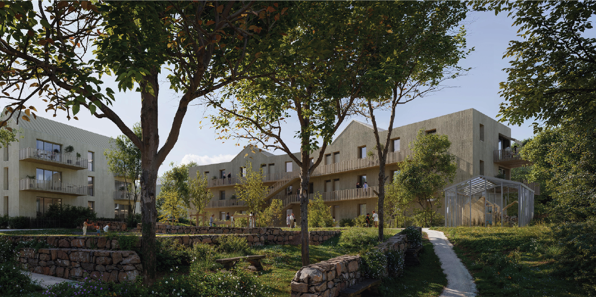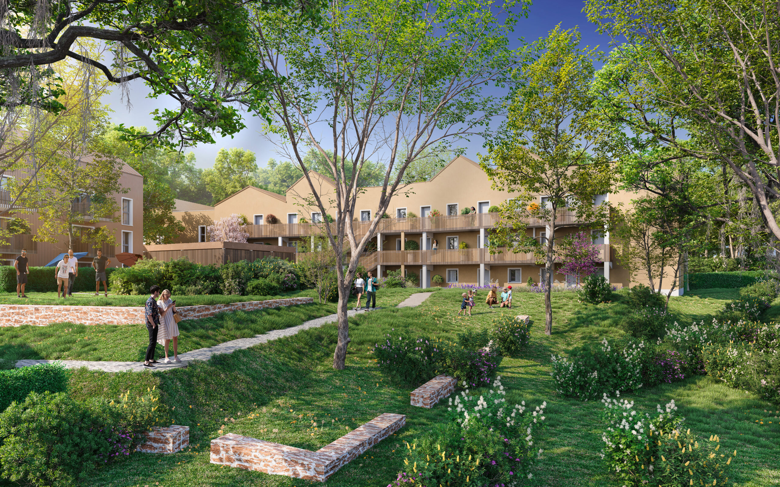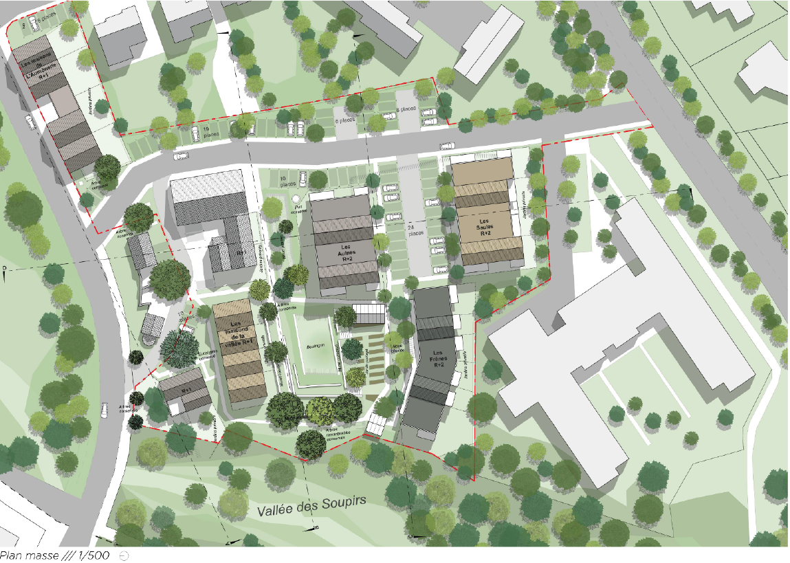 Les bâtiments sont implantés majoritairement selon l’axe Est-Ouest afin de dégager le maximum de percées visuelles vers la Vallée des Soupirs à l’Est, une respiration verte atout majeur du site, et offrir une orientation Sud à tous les logements.